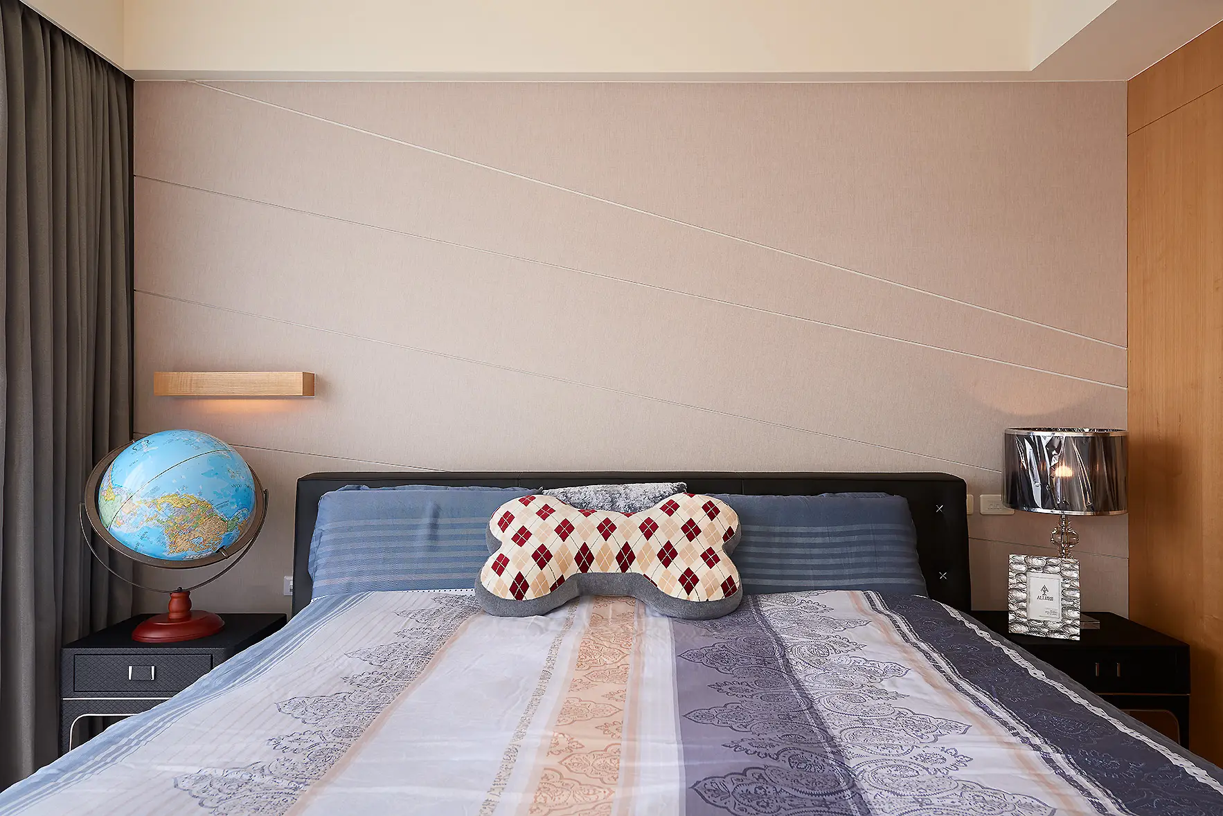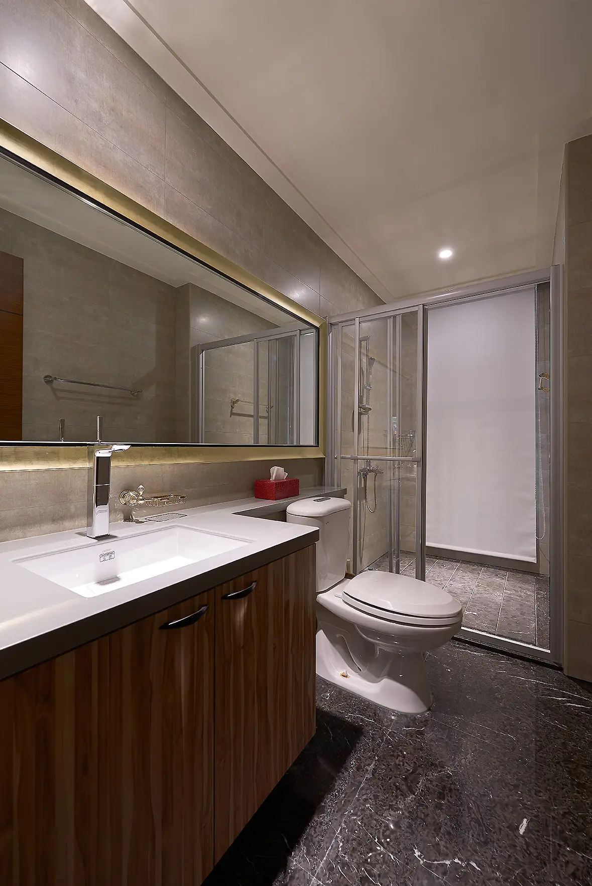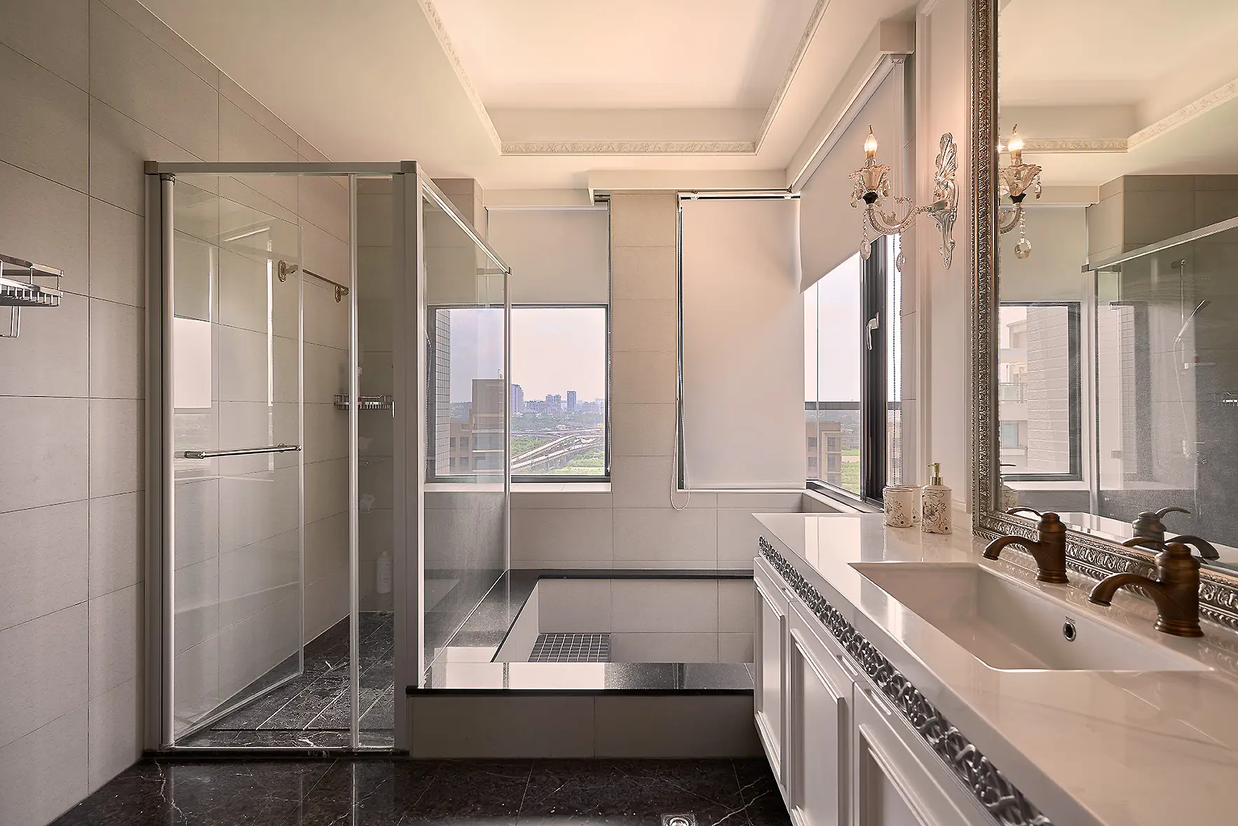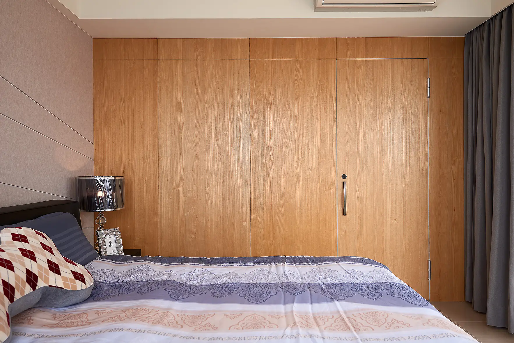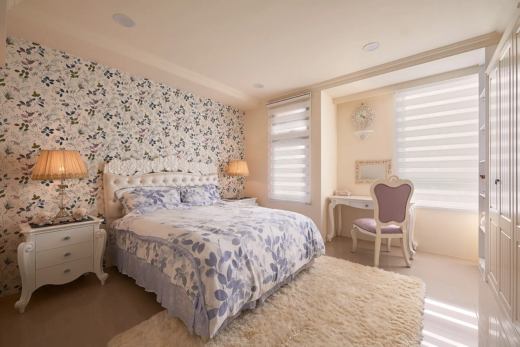 這是一間屋齡約四年的新古屋,原有部分輕裝潢與家具。因發現建材有發霉問題,拆除工程浩大,我們選擇在原有基礎上進行修飾與調整。天花板因潮濕導致變形與發霉,保留原格局後以線板、邊框與燈光重新修飾,兼顧美觀與工期效率。部分家具狀況良好予以保留,融入新設計中再利用。衣櫃與洗手台則透過新古典線板改造,為空間注入新意。