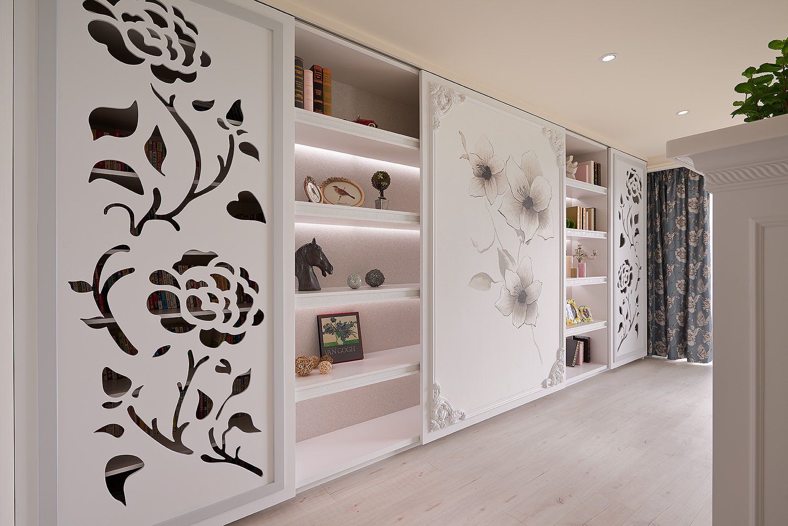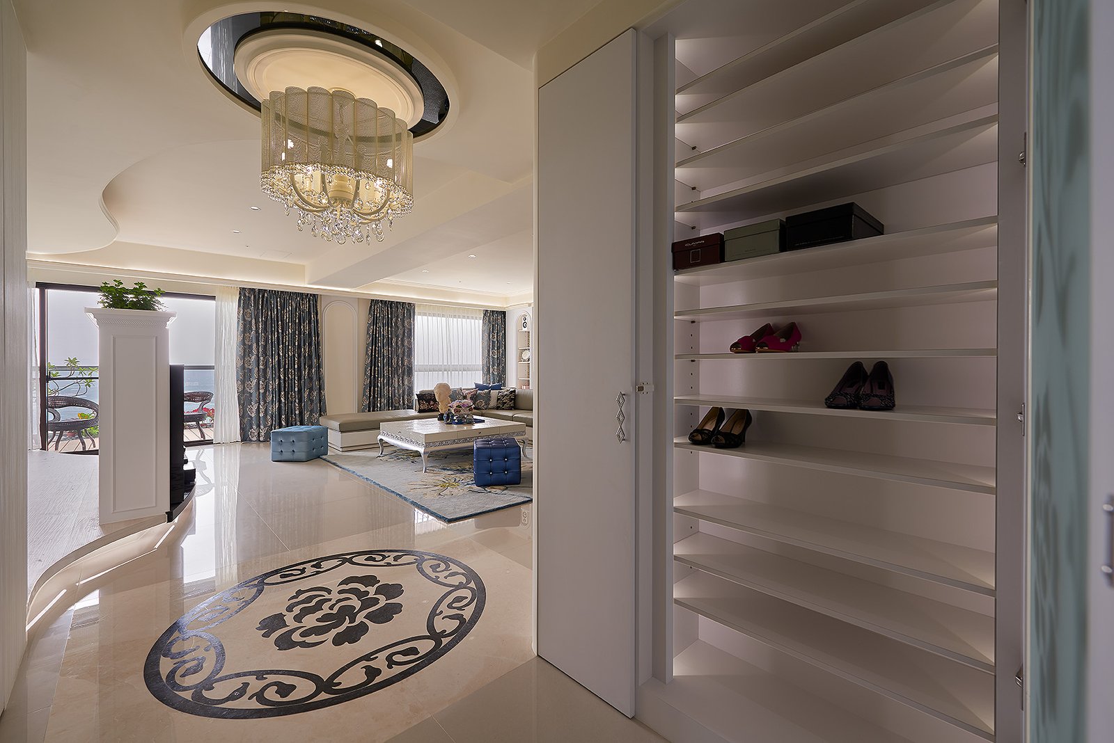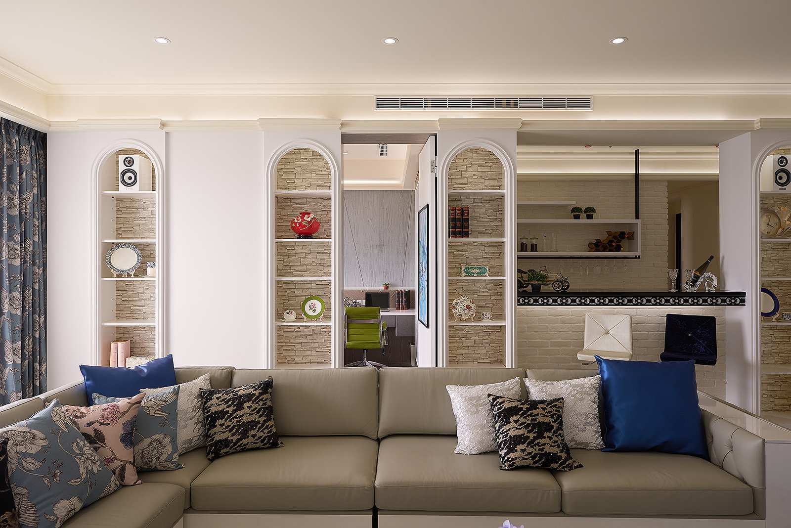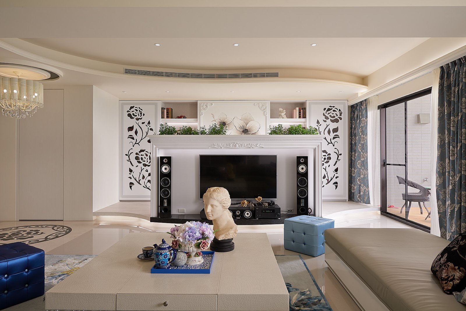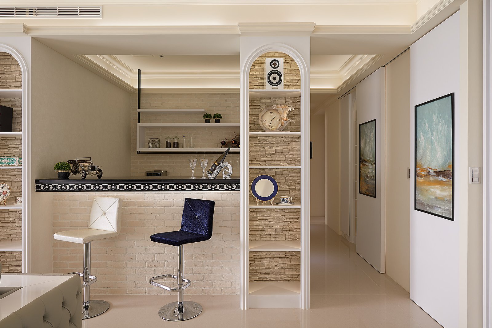 玄關以藍寶石大理石拼花與圓形天花呼應迎賓,弧形木地板延伸至陽台,引導視線穿越落地窗至圓拱展示櫃,再轉入跳色吧台與文化石牆,最後進入如玫瑰莊園般浪漫的主臥,層層堆疊出優雅細膩的空間敘事。