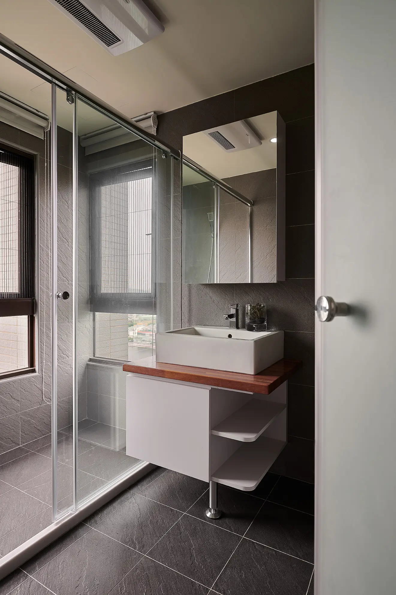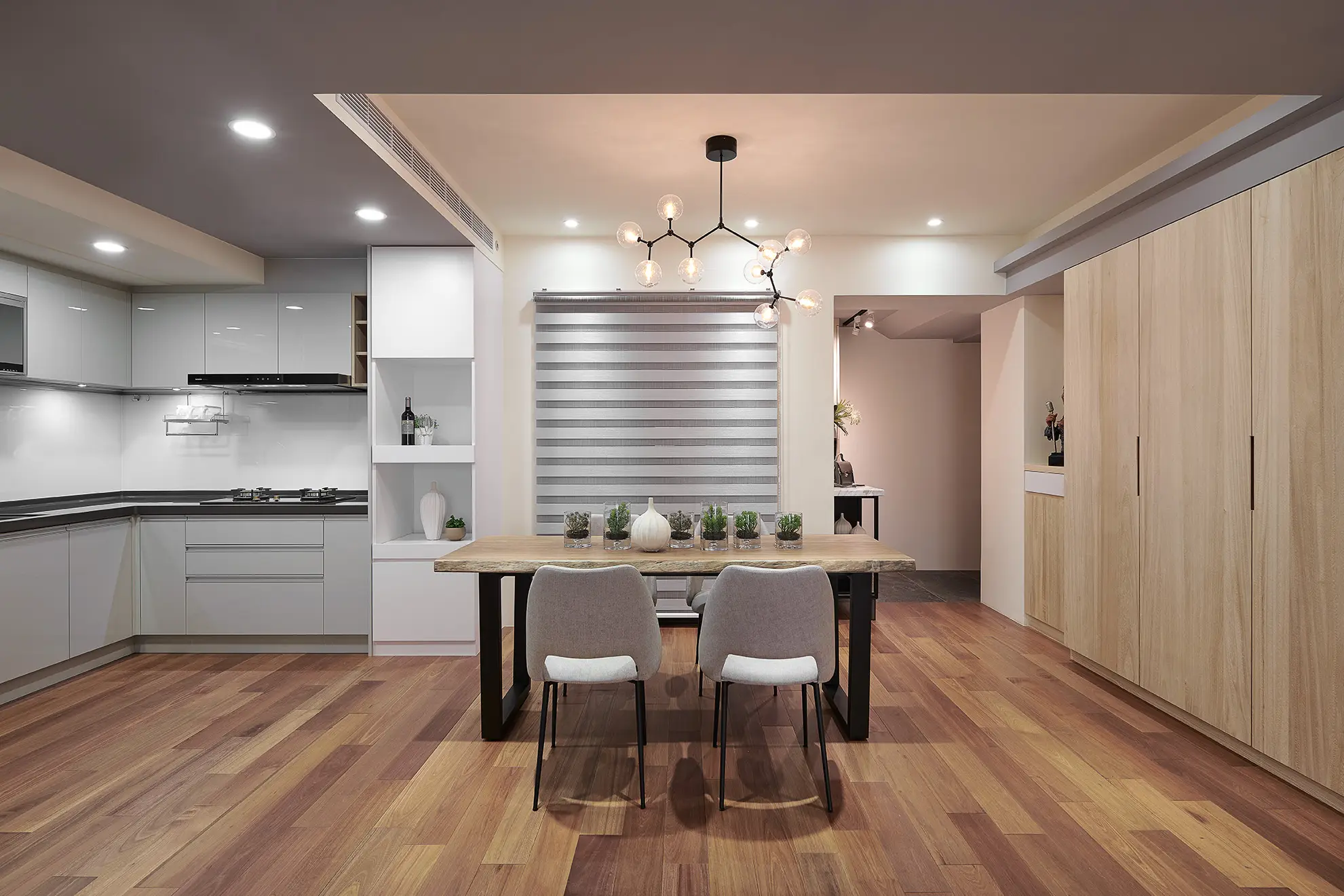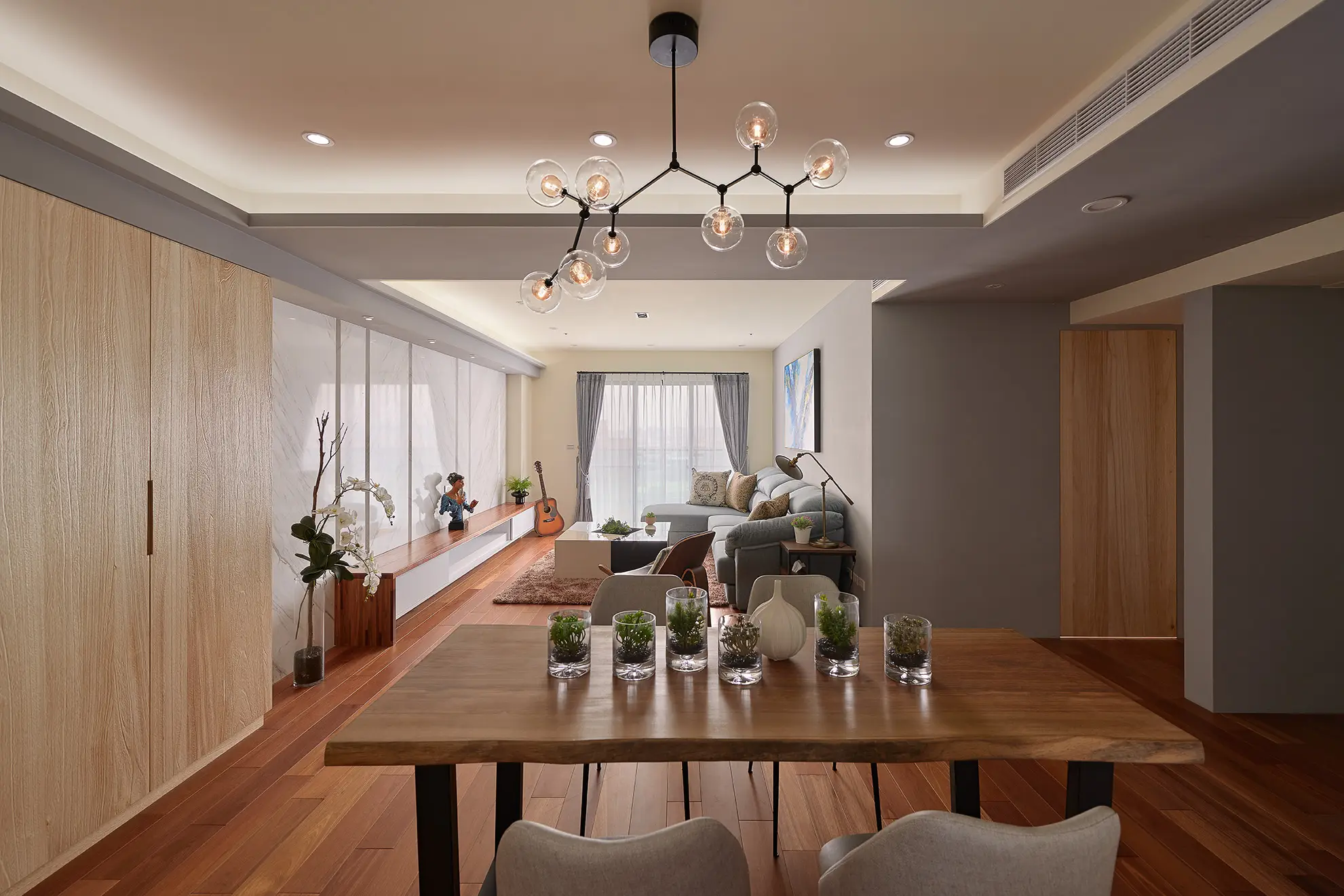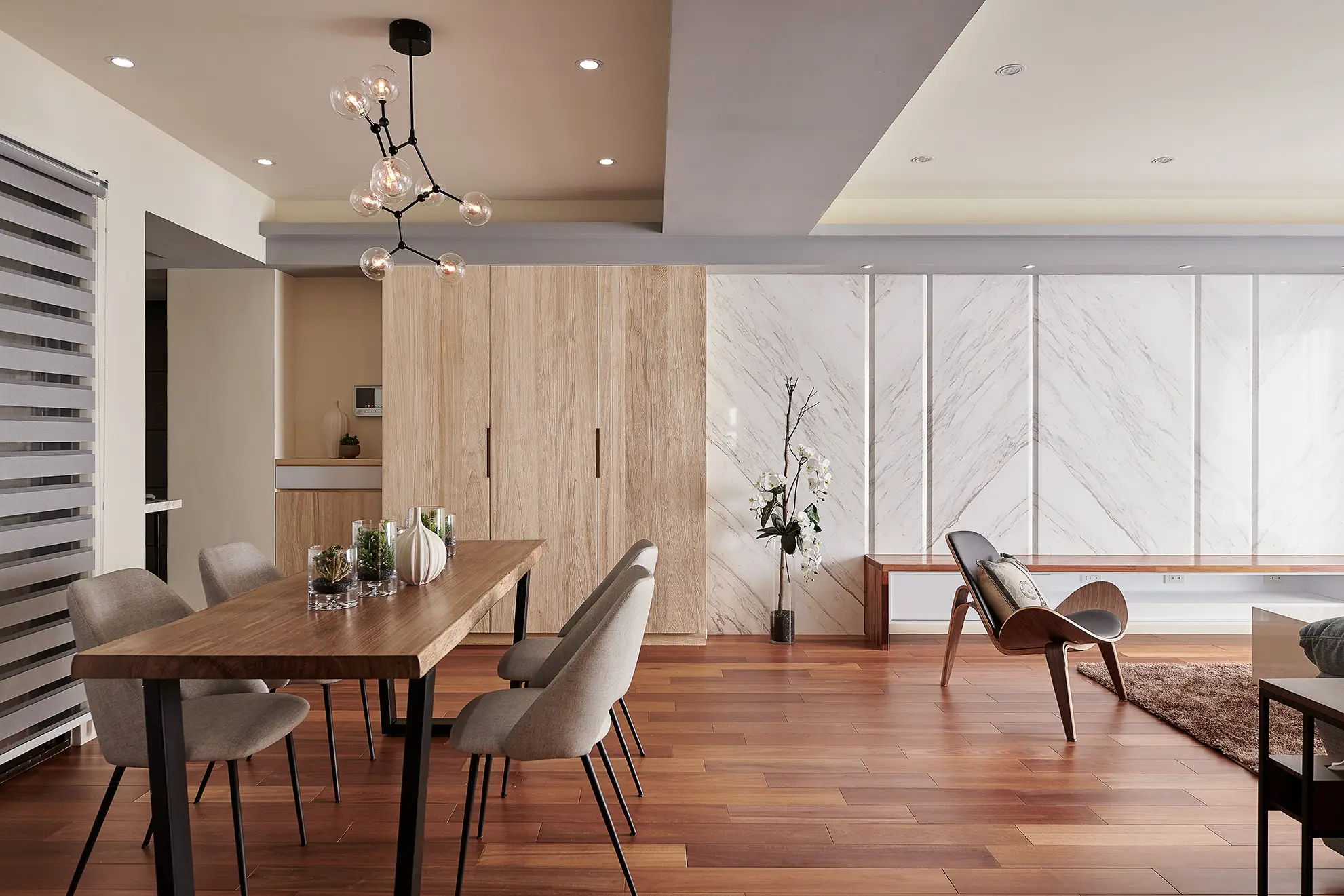 玄關以邊櫃與燈光創造開闊感,半腰櫃可移動方便搬運,大地磚與木地板交界處微微下凹,防止灰塵飄散。客餐廳設計以樑為引導,搭配灰色系統櫃與溫潤實木材質,強調線性與層次,並以高低天花板、藝術燈飾與畫作營造空間焦點。電視牆以大理石對切,細節體現精緻工藝。