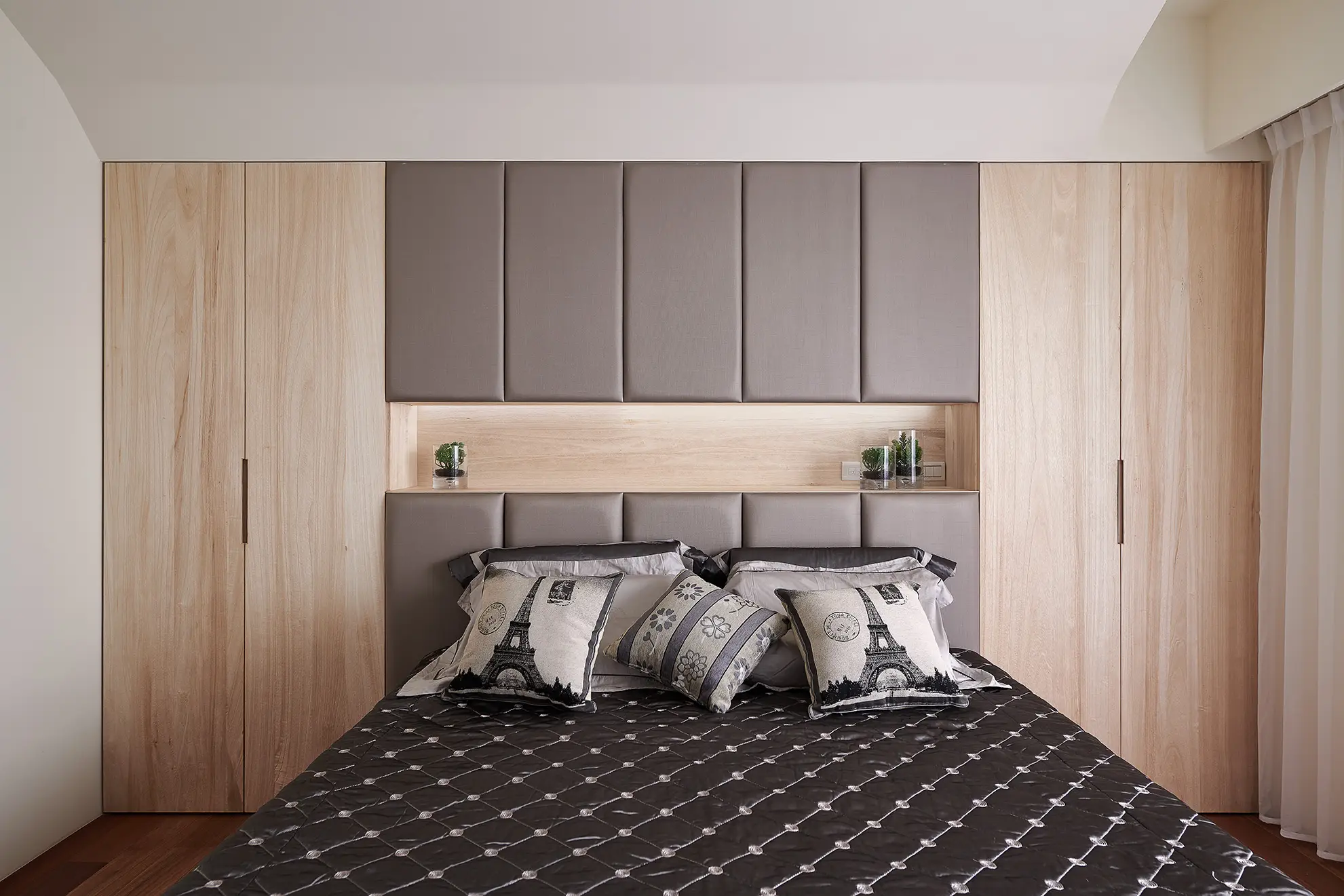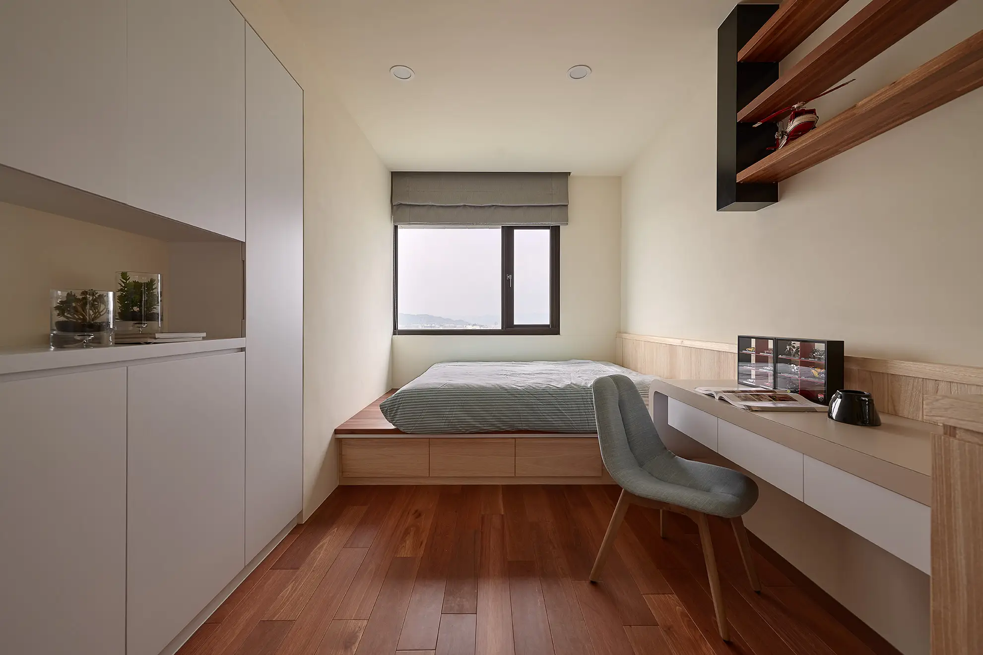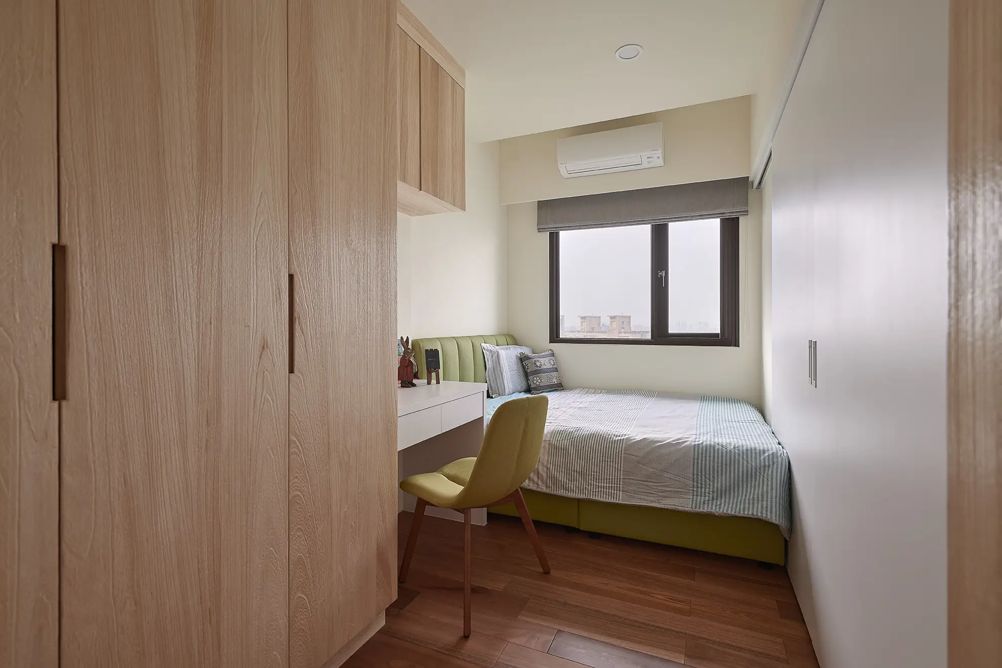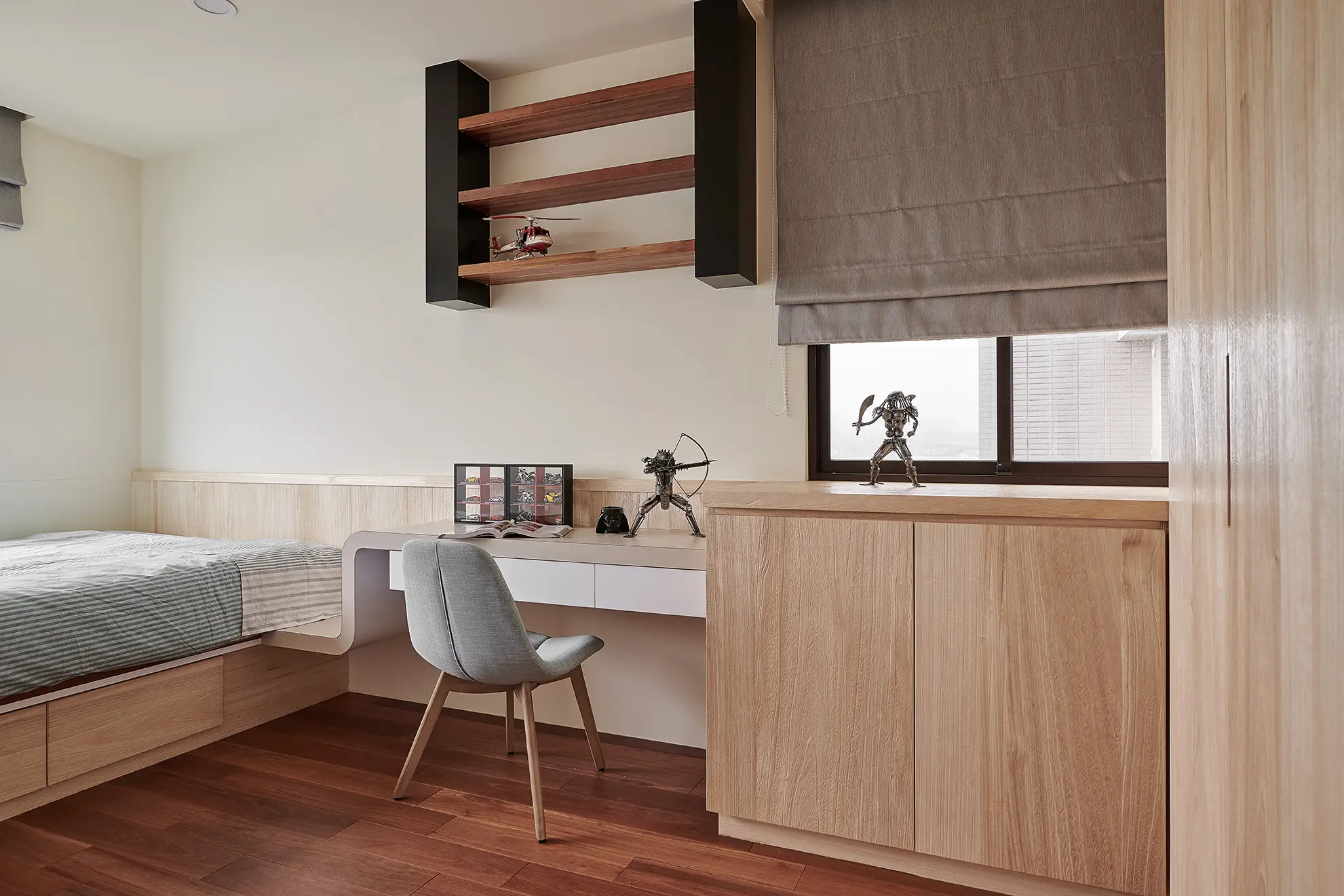 主臥床頭因應樑位設計轉折,整合收納與隔音材質,並隱藏化妝區,提升空間感。女孩房床尾共享收納,空間完整。男孩房兼遊戲室為長型格局,整合書桌與床邊櫃,還可作為陪伴閱讀的小座椅,兼具童趣與功能。