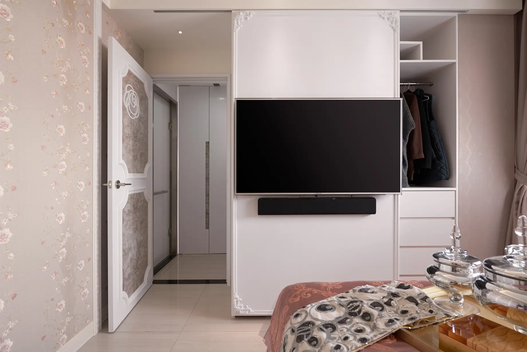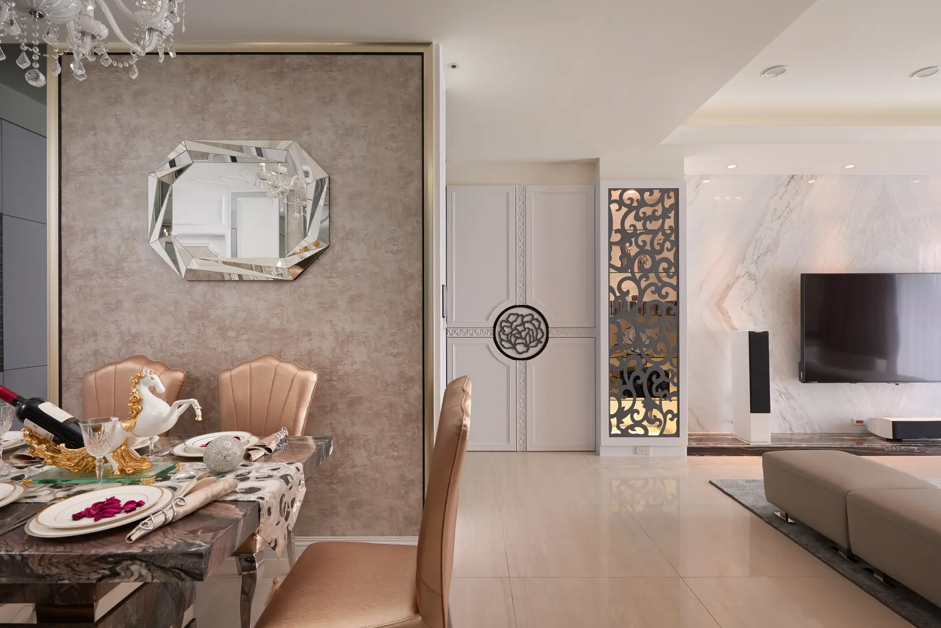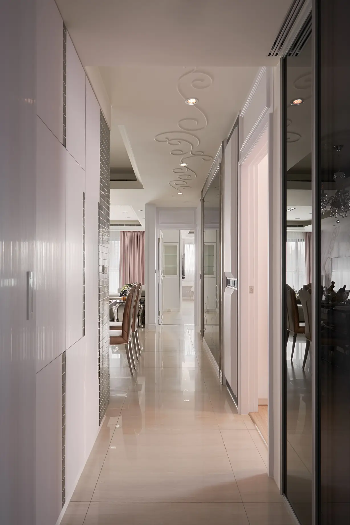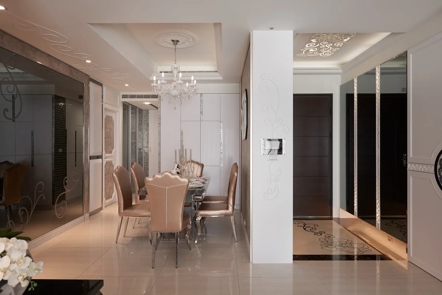 玄關設計獨具匠心,天花與地坪皆融入文創手繪花紋,透過雷射切割與玻璃燈光層疊,打造進門即被花朵環抱的溫馨氛圍。