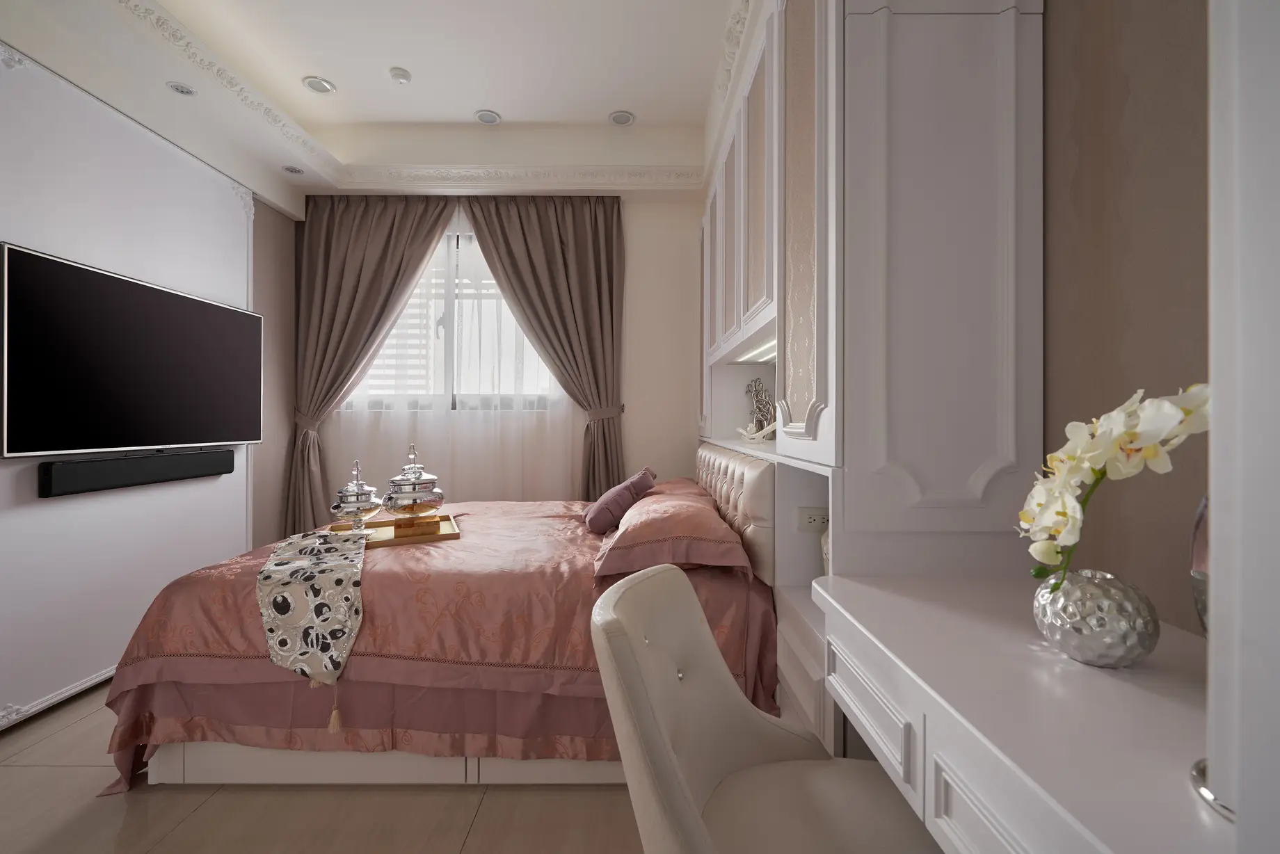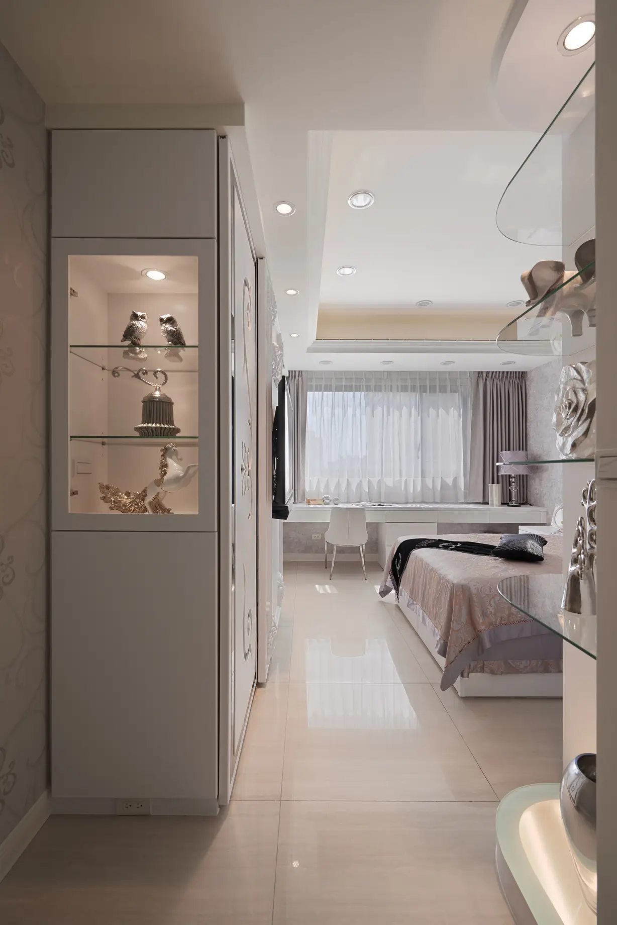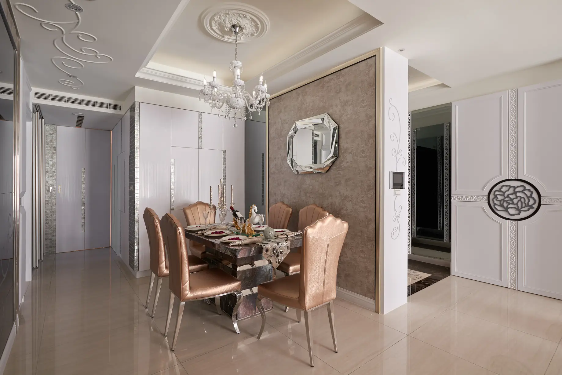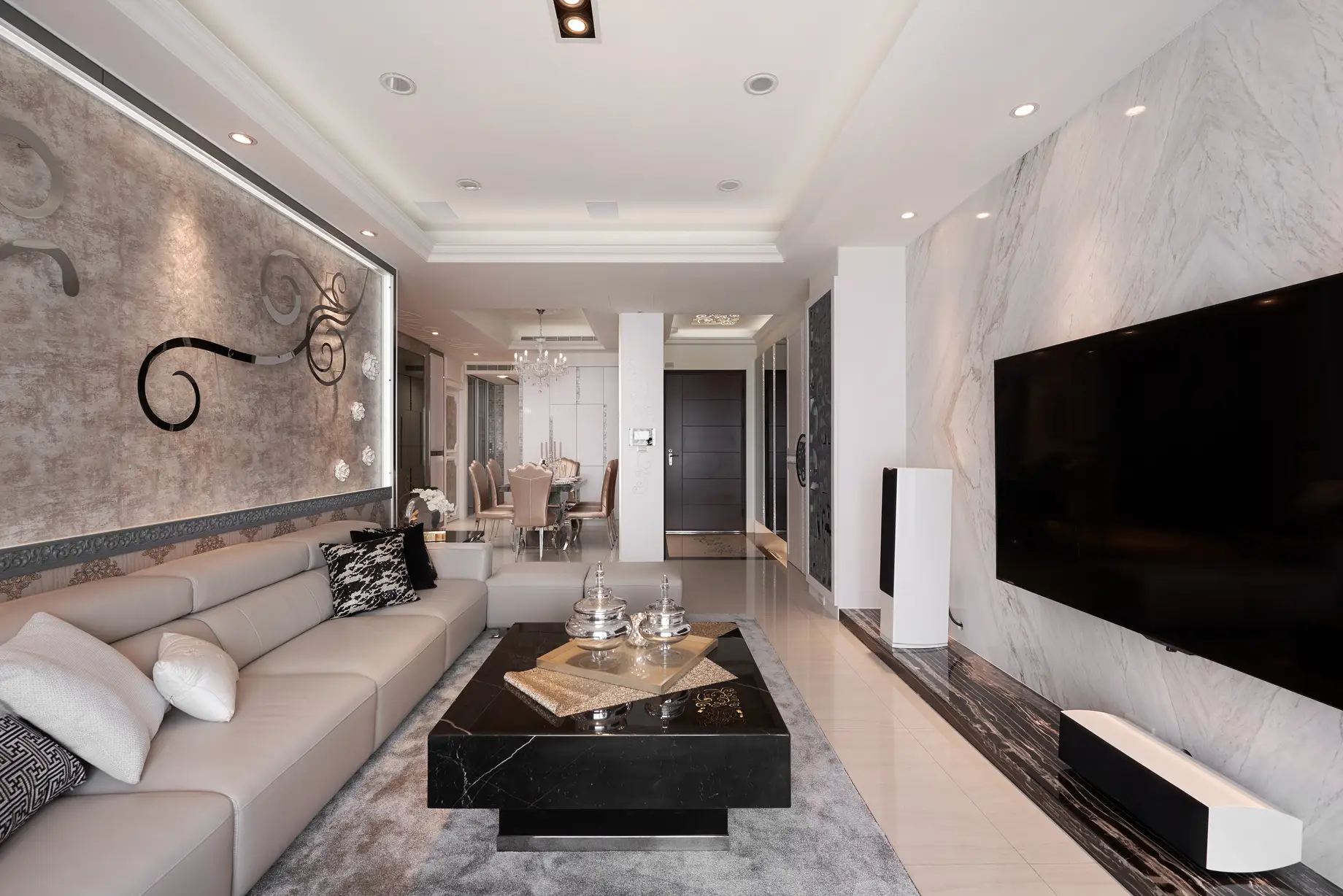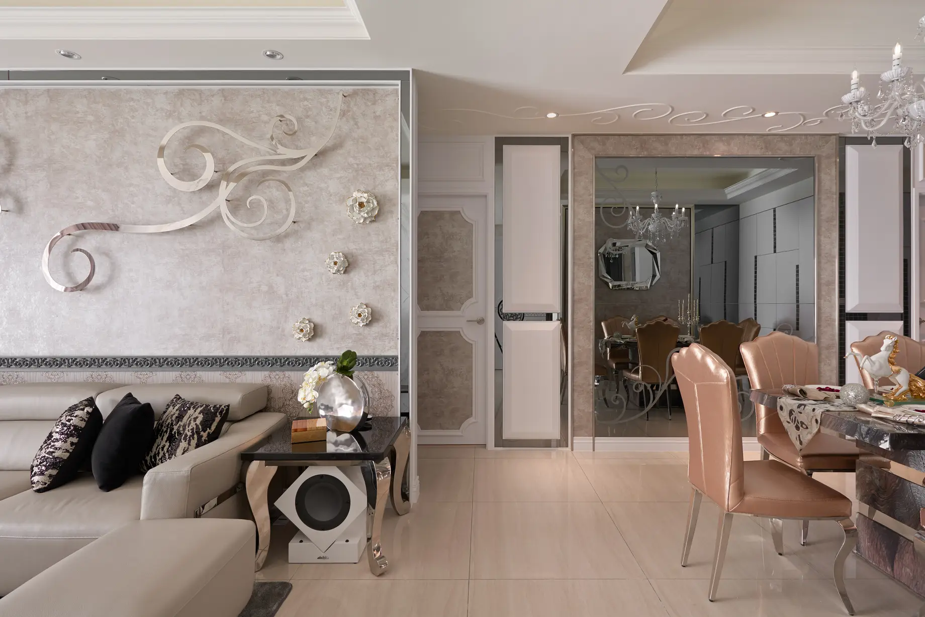 玄關設計獨具匠心,天花與地坪皆融入文創手繪花紋,透過雷射切割與玻璃燈光層疊,打造進門即被花朵環抱的溫馨氛圍。