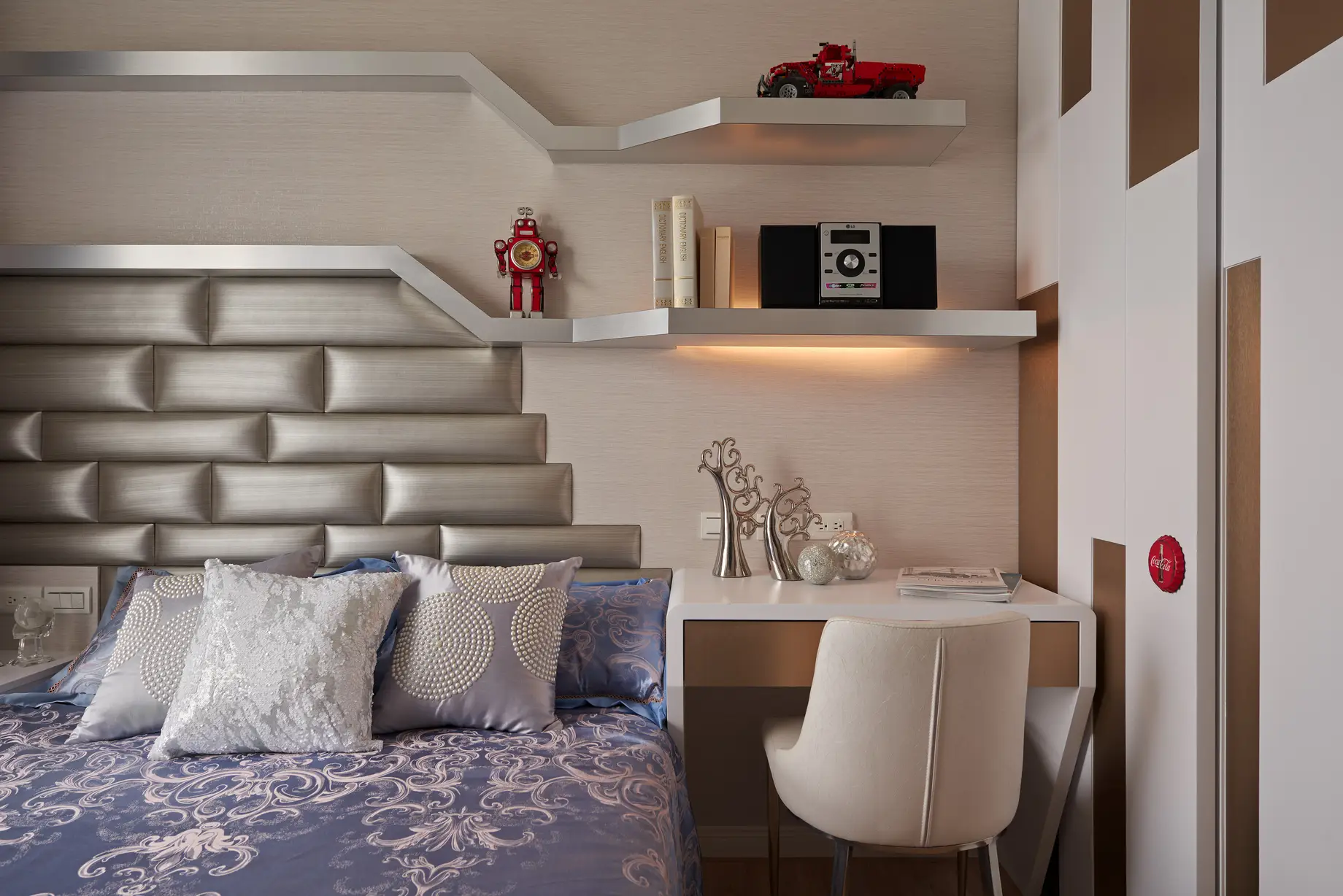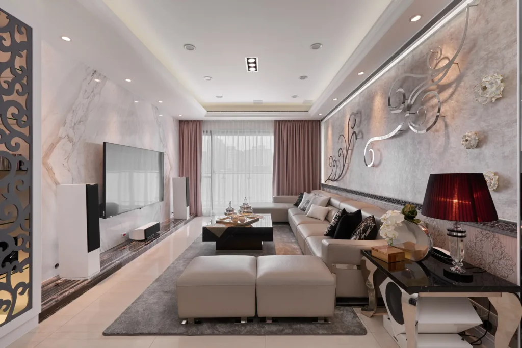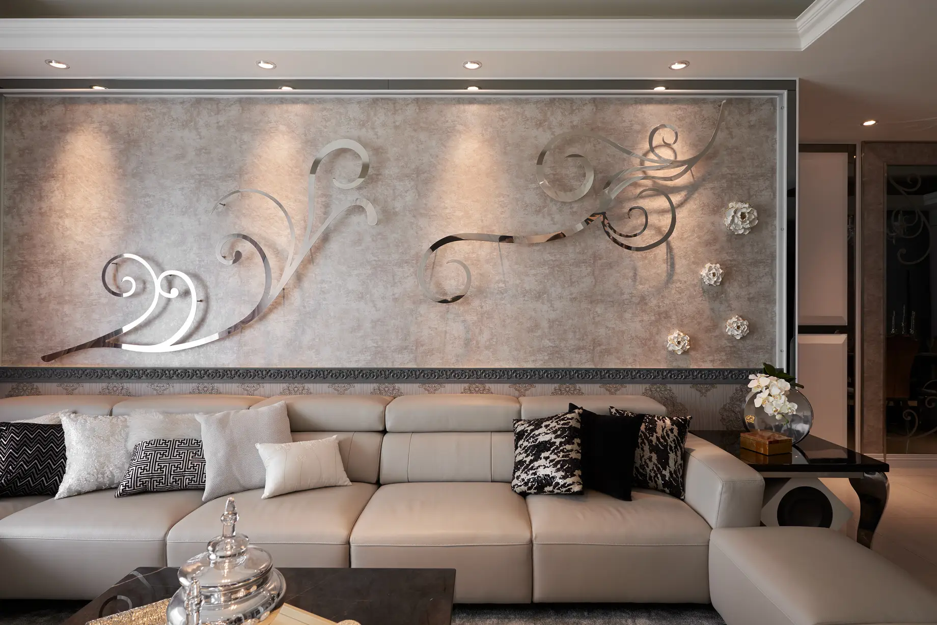 本案視覺設計以花為主題,象徵屋主一家人的凝聚與精神。以吉祥富貴的「牡丹」為核心語彙,串連全屋設計,並巧妙融合男屋主從事科技產業的背景,運用金屬板材與花朵線條交織,軟化冰冷質地,於客廳沙發背牆形成具象徵意義的大型裝飾藝術。