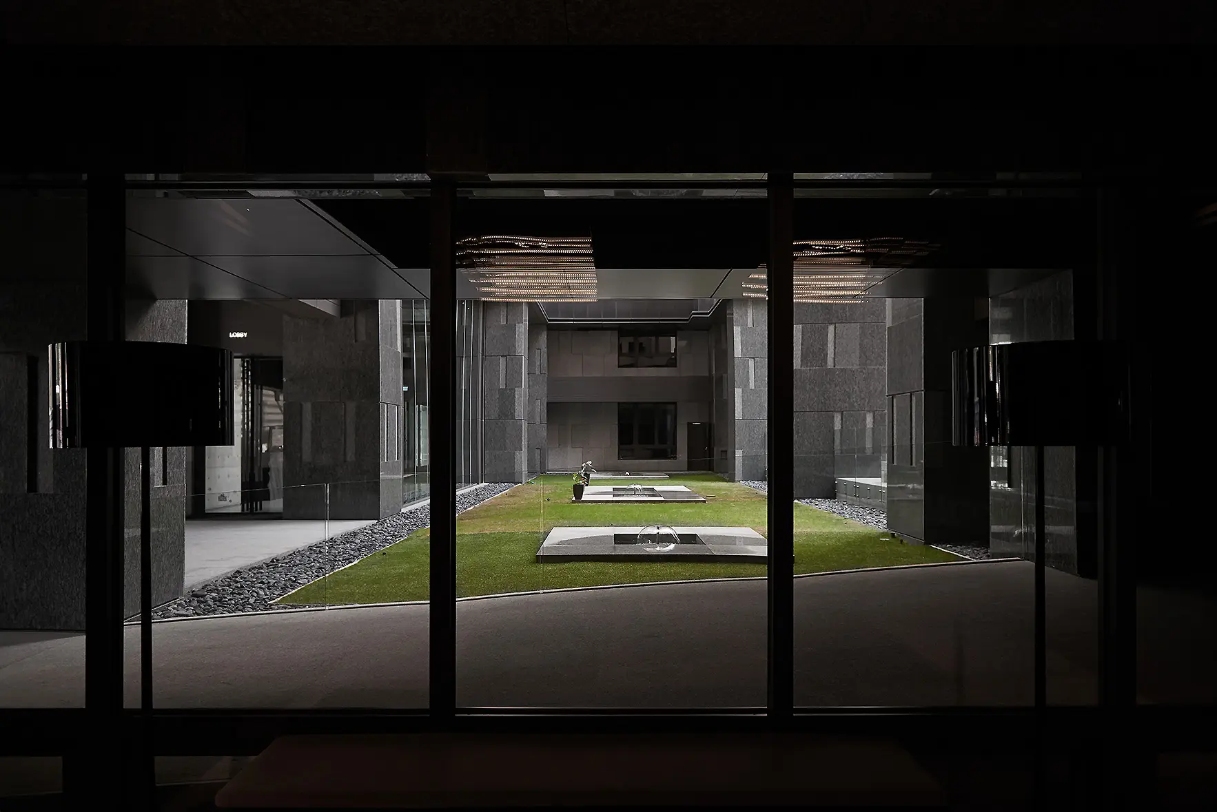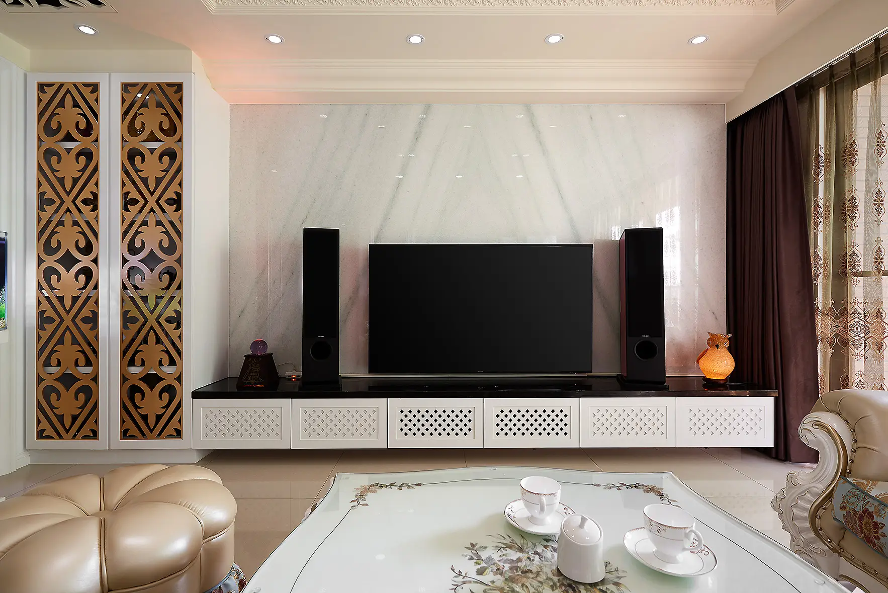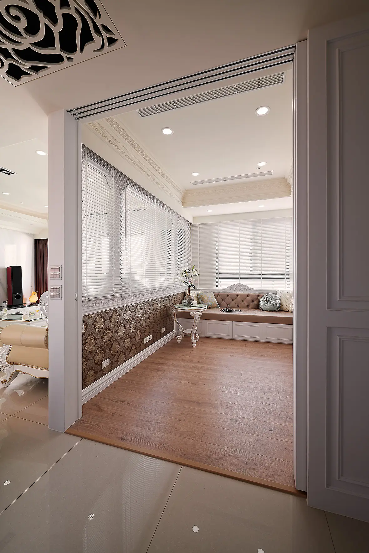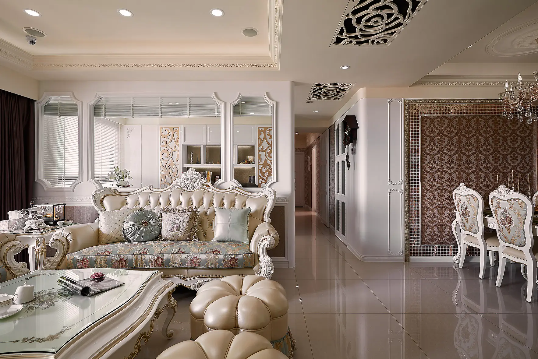 公領域以玻璃與雕花板延展視覺,打造通透流動感。